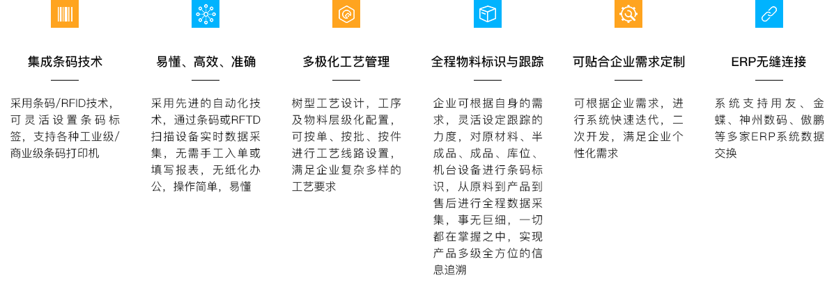 • 实时、高效、准确地跟踪产品,在每道工序及每个质检环节的全过程,使企业具备更完善、更有竞争力的生产过程和品质管理能力。